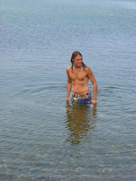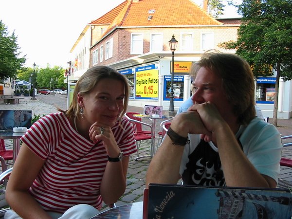 Da es in der Zwischenzeit wieder nett aufgeklart ist, lungere ich noch eine Weile am Strand, sammle ein paar Souvenir-Steine für Daheimgebliebene und geniesse das Meeresrauschen. Vor der Heimfahrt habe ich noch einen Programmpunkt: ich teste eine Eigenkomposition, die ich auf CD im Wagen habe, auf ihre Tauglichkeit. Denn bei der Aufnahme hatte ich an eben diese Stelle des Steilufers denken müssen. Zwar kommt der Song "Towards The Ocean" optisch, olfaktorisch und gefühlt nicht an das Original es Meeres heran, ich stufe ihn dennoch zufrieden als passend ein.Wieder in Oldenburg, treffe ich vor der Hofauffahrt auf Carsten und Melanie, die mit seinem schwarzen Cabrio aus der entgegengesetzten Richtung ankommen. Gutes Timing also, denn wir wollen zum Abendessen nach Heiligenhafen. Dort futtere ich ein paar panierte Tintenfischringe und herrlichen Specksalat (Kartoffelsalat mit Essig-Öl-Dressing statt Mayo), so lecker wie das Essen ist, so niedrig sind auch die Preise. Anschliessend holt sich jeder ein Eis zum Nachtisch bei der Hafeneisdiele, die seit Jahren ihren legendären Ruf bei uns weg hat. Mit dem leckeren Naschwerk schlendern wir nochmals durch die Innenstadt, machen uns früh wieder auf nach Hause. In Oldenburg ziehen wir in die Altstadt, um dort für Mittwoch einen Tisch im Akropolis zu bestellen. Aus Erfahrung der letzten Jahre wissen wir, daß das griechische Restaurant in der Hauptsaison jeden Abend überfüllt ist. Da uns nichts nach Hause zieht, setzen wir uns noch eine Weile in eine Kneipe am Marktplatz hin, trinken ein paar Bierchen, quatschen und bestaunen die Dorf-Gang, die mit tiefergelegten Karren, quietschenden Reifen und lauter Musik auf sich aufmerksam macht. Gegen 23:00 Uhr sind wir daheim, ich schaffe noch ein paar Seiten im Urlaubsbuch, dann endet der Tag. Dienstag 11.07.2006 - Übers Meer